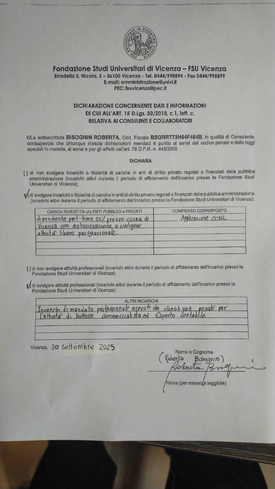 Bisognin Roberta         Dettagli   CV      Dichiarazione  - Attivo